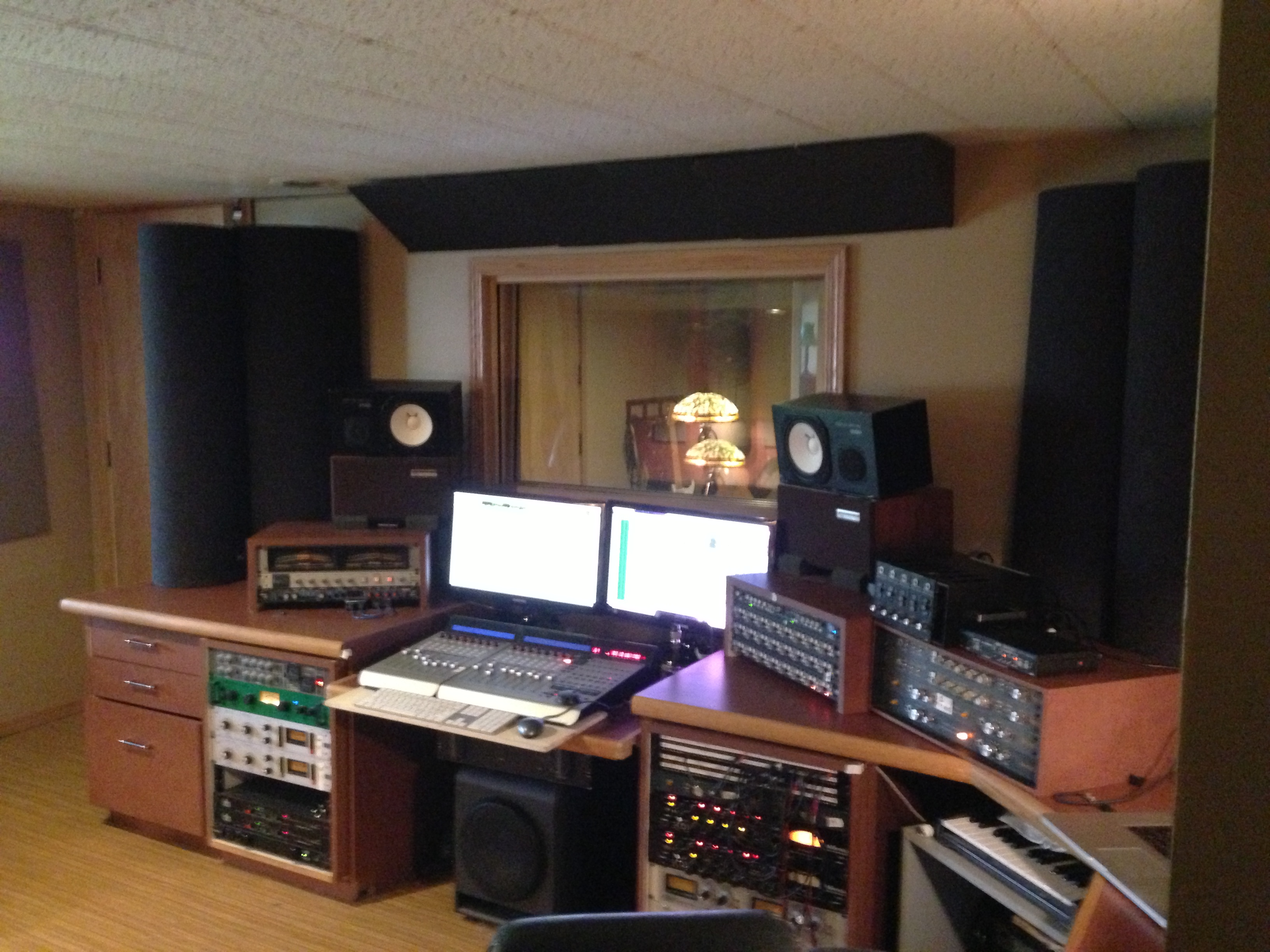 A control room and 3 separate tracking rooms with sliding glass acoustic doors